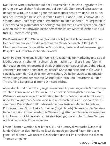 Gernot Steinfels, Gründer eines Feinwäschegeschäfts ist mit 94 Jahren friedlich eingeschlafen. Lang lässt sich die Ruhe nicht wahren, denn die vom neuen Firmenchef gestiftete Trauerschleife mit der Aufschrift „In tiefer Trauer. Deine Mitarbeiter“ verwandelt die einst würdevoll geglaubte Trauerfeier in ein Schlachtfeld der Emotionen. Vor allem die Mitarbeiterinnen zeigen sich empört. Ein Versehen oder ein weiteres Beispiel aus dem Alltagssexismus der alten weißen Männer? Ein Stück über Generationen und ihre Ansichten, bei denen selbst der Pfarrer an seine Grenzen kommt.
